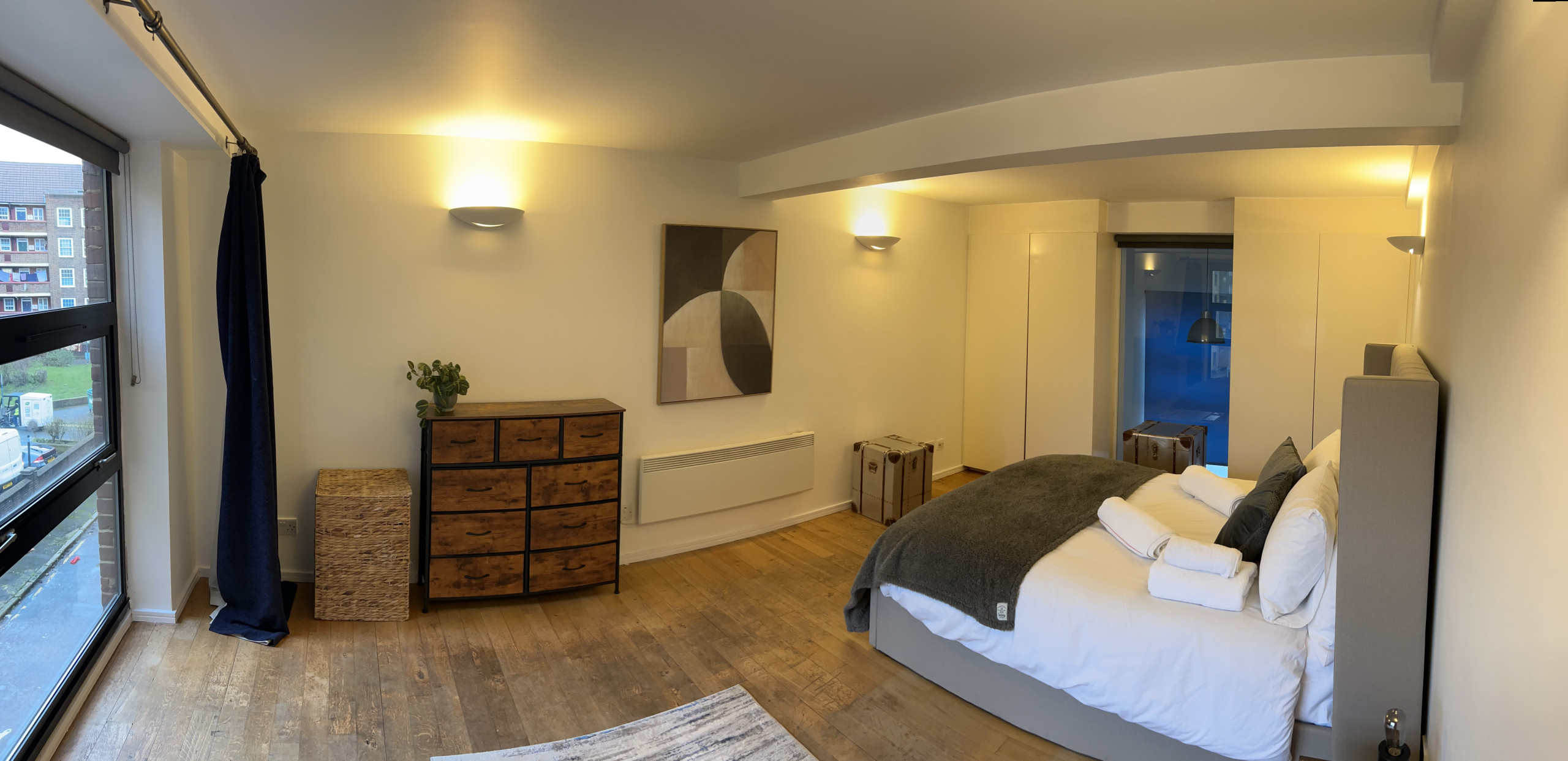 The London Warehouse is a great space comprising over 110 Square meters. The apartment has double height ceilings and a spacious open plan living dining room, we have a WC on the lower floor and a full bath and shower in the bedroom floor. The location is within the zone one station of Vauxhall and Kennington underground stations which gives easy access to central London in one or two stops. If you are two work colleagues or two couples staying in a Two Bedroom apartment in Central London this is the choice for you. We have Two bedrooms, one King and one super king beds plus the living area with a large dining table and leather sofas.